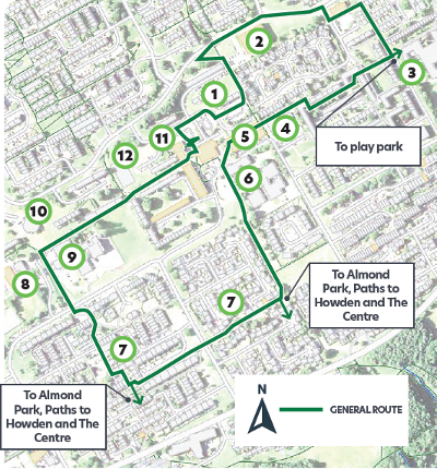 - Passing through houses in the 'Walks' - these were the first houses to be built in Craigshill. They are all named after a Scottish Loch, followed by 'Walk' - this route is between Garry Walk and Torridon Walk, passing Leven Walk, Morlich Walk and Doon Walk.