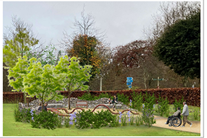 • Low ongoing maintenance requirement is a key feature of the proposal, which includes traditional drystone wall seating in keeping with that in the wider park, a centrally placed original focal point artwork entitled 'The Ribbon', partial screening of the site by subtle planting of native trees, low level shrubs and hardy plants, along with a new accessible path to the seating area.